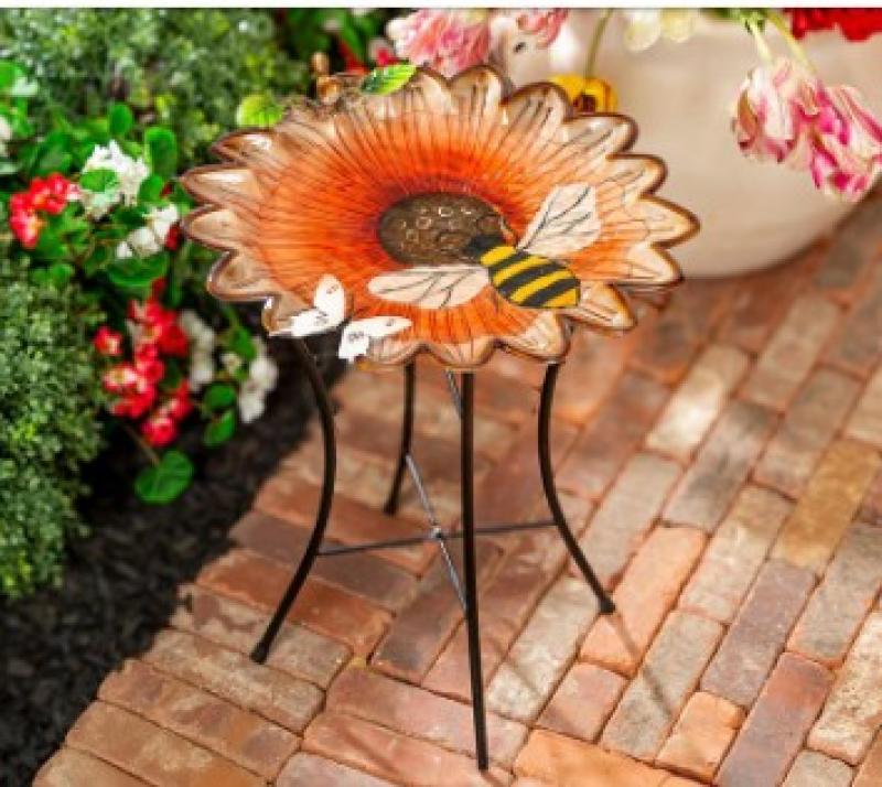 Sunflower & Bee Metal Bird Bath W/stand 16.5"