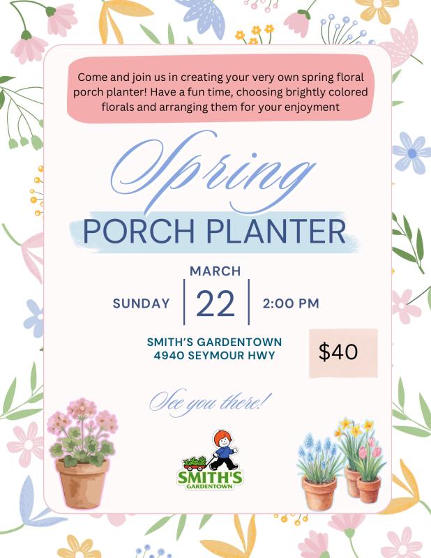Ready to refresh your porch for spring? Join us at the garden center on March 22 at 2:00 PM to create your very own beautiful Spring Porch Planter!
